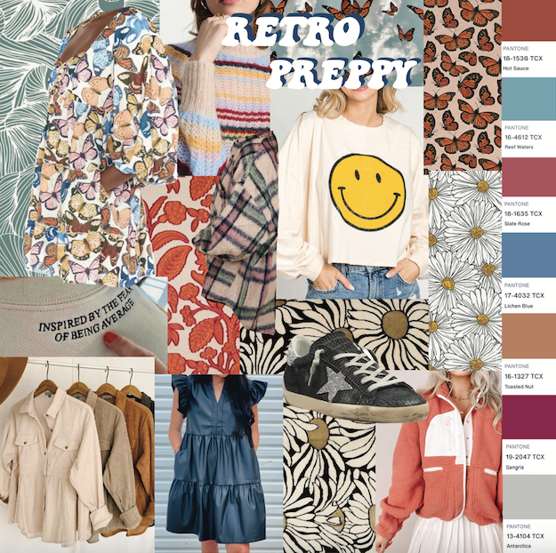 The "Retro Prep" collection blends vintage floral patterns, comfy sweaters, and earthy tones for a nostalgic yet modern feel. Color blocking adds a playful twist, perfect for those who love a preppy style with a retro edge.